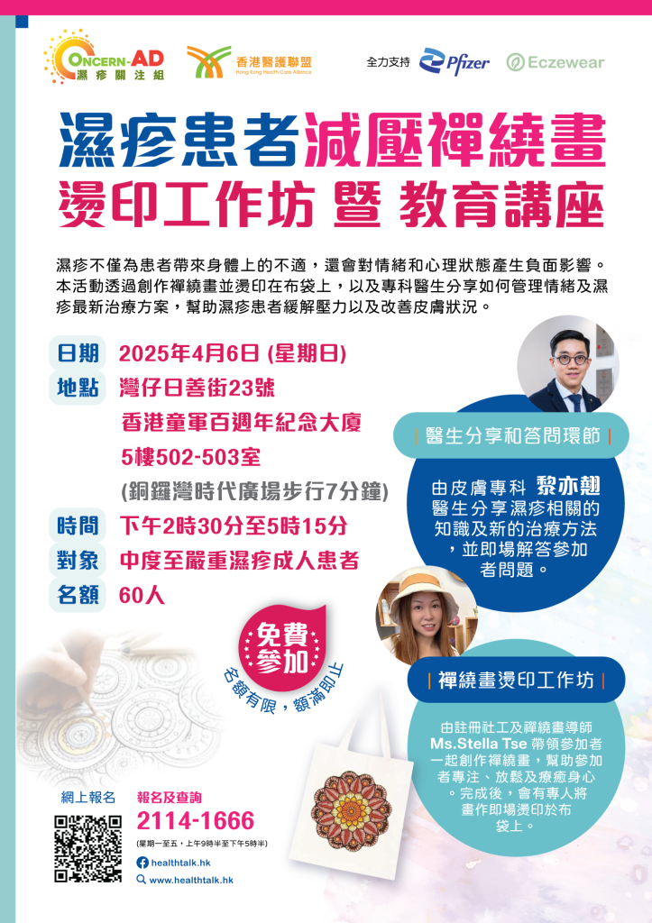 濕疹不僅為患者帶來身體上的不適,還會對情緒和心理狀態產生負面影響。本活動透過創作禪繞畫並燙印在布袋上,以及專科醫生分享如何管理情緒及濕疹最新治療方案,幫助濕疹患者緩解壓力以及改善皮膚狀況。活動後,參加者可獲贈自己手繪及獨一無二的布袋1個及濕疹舒敏服裝品牌 Eczewear T-shirt 換領券1張!👨🏻‍🎨🎨🖌️👩🏻‍🎨