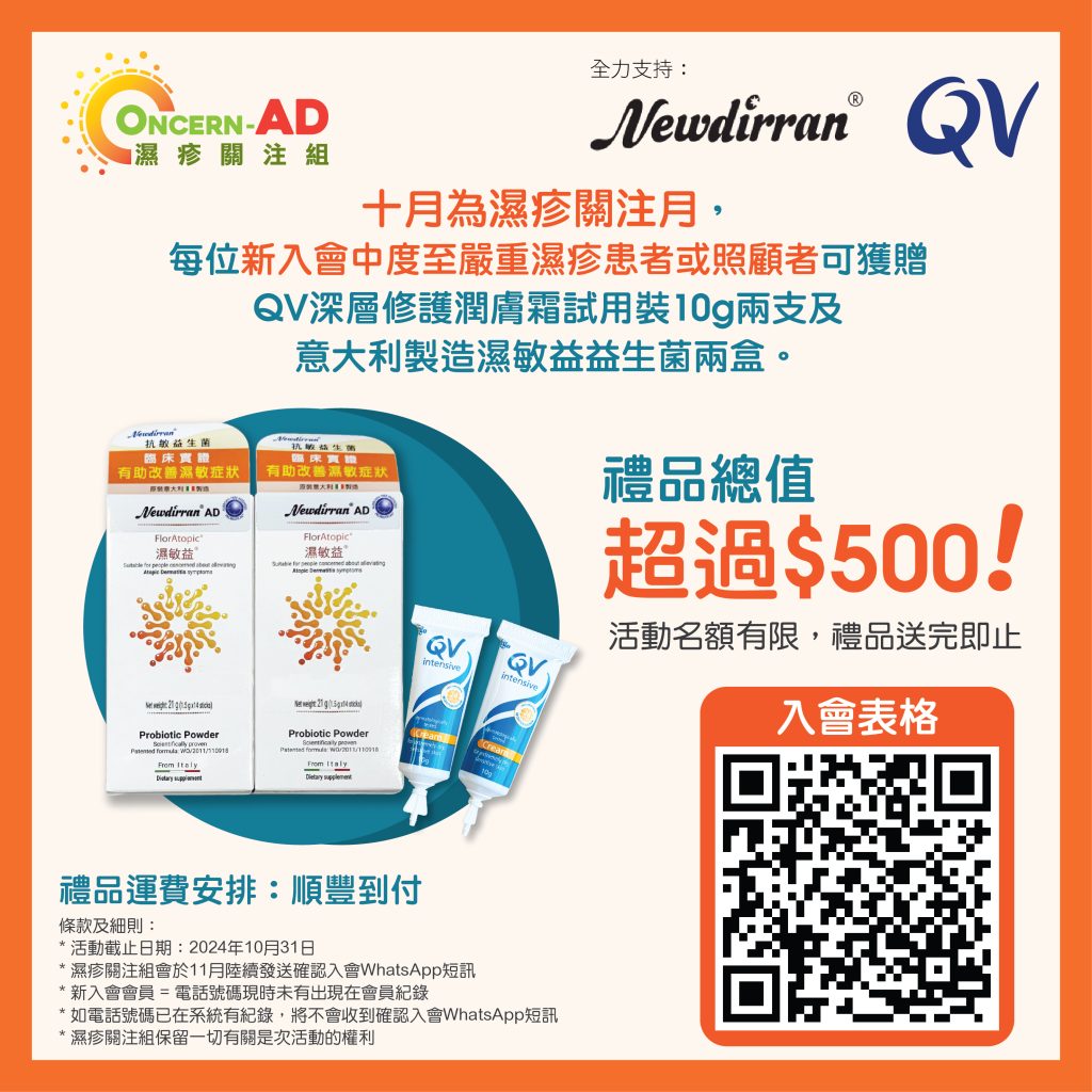 十月為濕疹關注月,每位新入會中度至嚴重濕疹患者或照顧者可獲贈QV深層修護潤膚霜試用裝10g兩支及Newdirran意大利製造濕敏益益生菌兩盒,入會費用全免。🌟