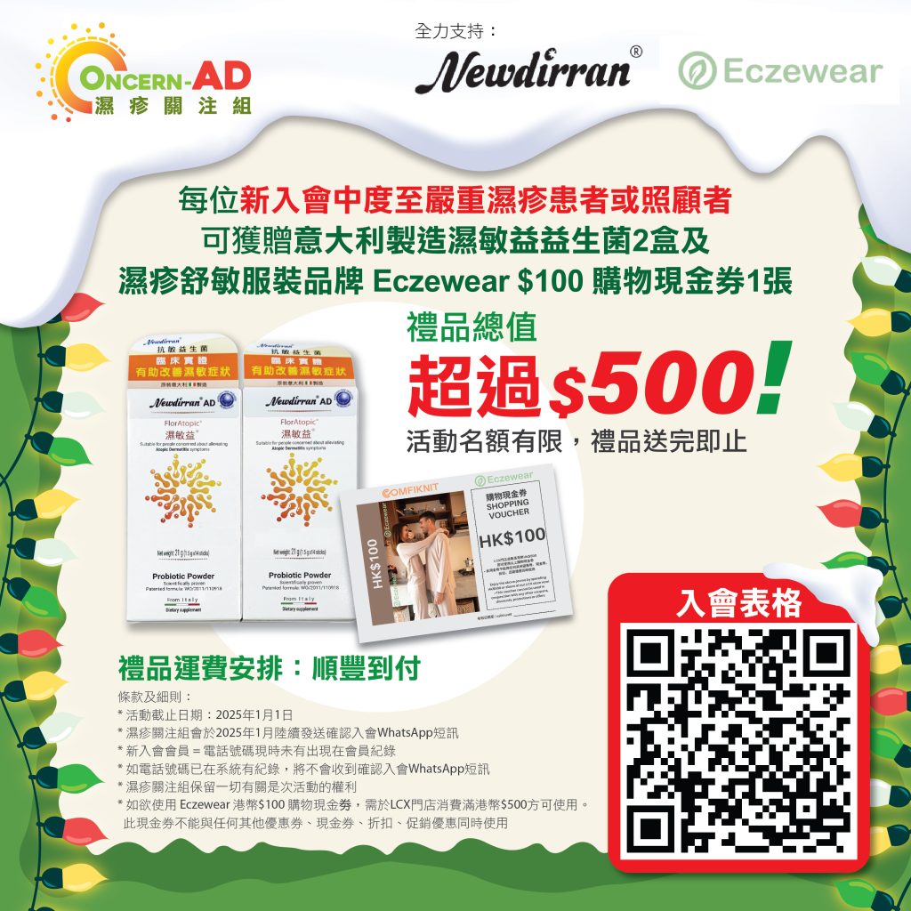🎄🎅🏻 聖誕將至,每位新入會中度至嚴重濕疹患者或照顧者可獲贈意大利製造 Newdirran 濕敏益益生菌兩盒及濕疹舒敏服裝品牌 Eczewear $100 購物現金券1張,入會費用全免 🎅🏻🎄
