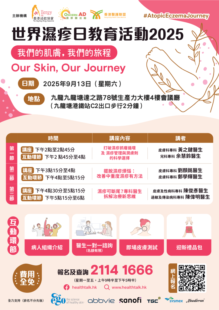 2025年世界濕疹日的主題是「我們的肌膚,我們的旅程 (Our Skin, Our Journey)」✨;香港過敏協會、濕疹關注組及香港醫護聯盟希望透過這次活動,您能與我們共同分享這些經歷 🤝 支持彼此,攜手面對這段抗病旅程!💪